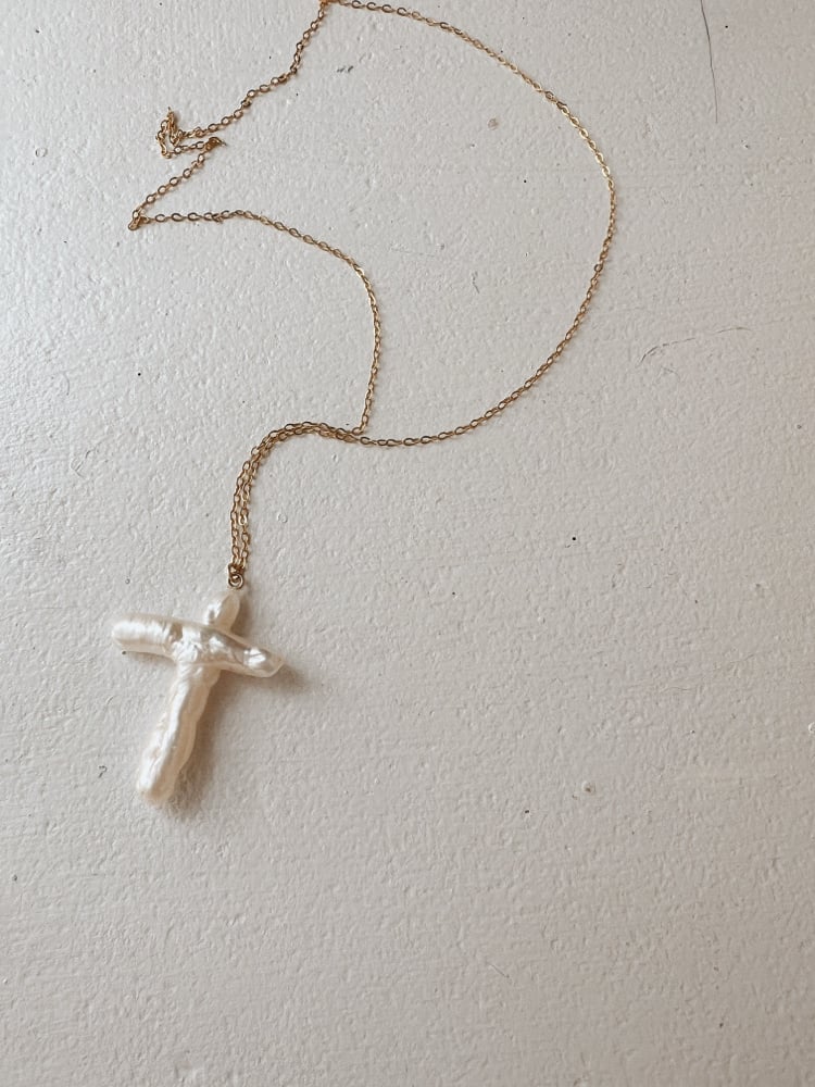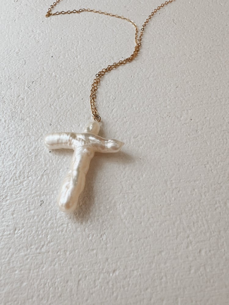 A natural cross pearl on a gold-filled chain.